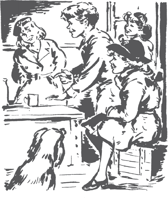 Но это была вовсе не Сьюзи. Это мама Питера и Джанет пришла поинтересоваться, известно ли членам «Секретной семёрки», сколько сейчас времени. И она очень удивилась, когда навстречу ей из двери выскочил Скампер, лая что было сил. Как же бедняга разочаровался, увидев, что это всего-навсего мама Питера!