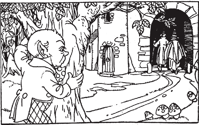 Колдун Красная Мантия меж тем пришёл в лес, а с ним его подруга. У неё, как у всех ведьм, была с собой метла.