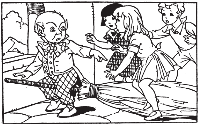Луник наблюдал за ними, спрятавшись за деревом. Потом в голову ему пришла отличная идея, и он схватил метлу.