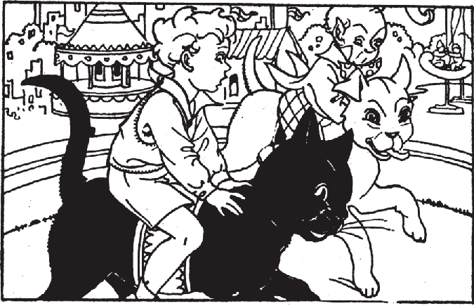 Джо умчался на слоне, Бет и Фрэнни ускакали на жирафах, Луник – на собаке, а Робина унёс чёрный кот.