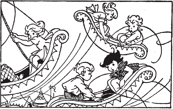 И вдруг лодки-качели как сговорились – сорвались с цепи и взмыли в небо. Их теперь не остановить.