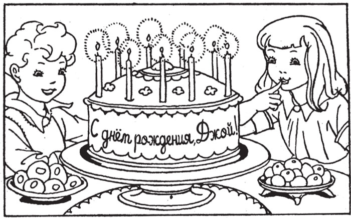 Именинный торт был украшен девятью свечами и надписью из крема: «С днём рождения, Джой!»