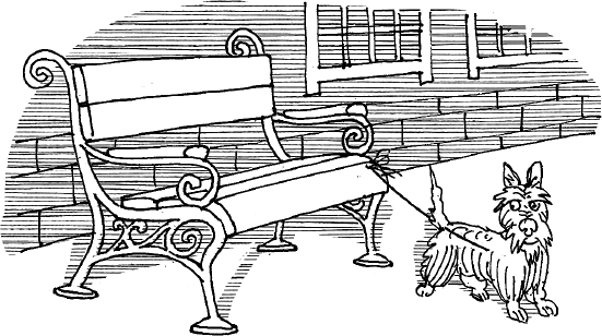 Не заметив Бастера, дама с пуделем села на скамейку. Пёс начал обнюхивать шубу незнакомки, а Поппет зашлась в испуганном лае. Бастер выскочил из-под скамейки, обвив поводком ноги женщины. Та закричала и ещё крепче прижала к себе пуделя, пытаясь оградить от нападения.
