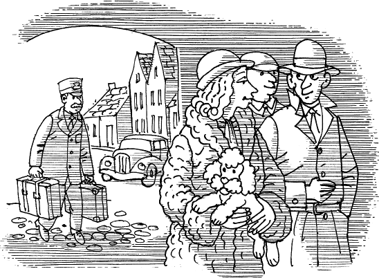 Голос мужчины был зычным, поэтому носильщик сразу подбежал к такси и подхватил два небольших чемодана. Мужчина вышел из машины и подал руку женщине, помогая ей выбраться. Они оба были средних лет, хорошо одеты и веселы. Дама держала в руках маленького белого пуделя.