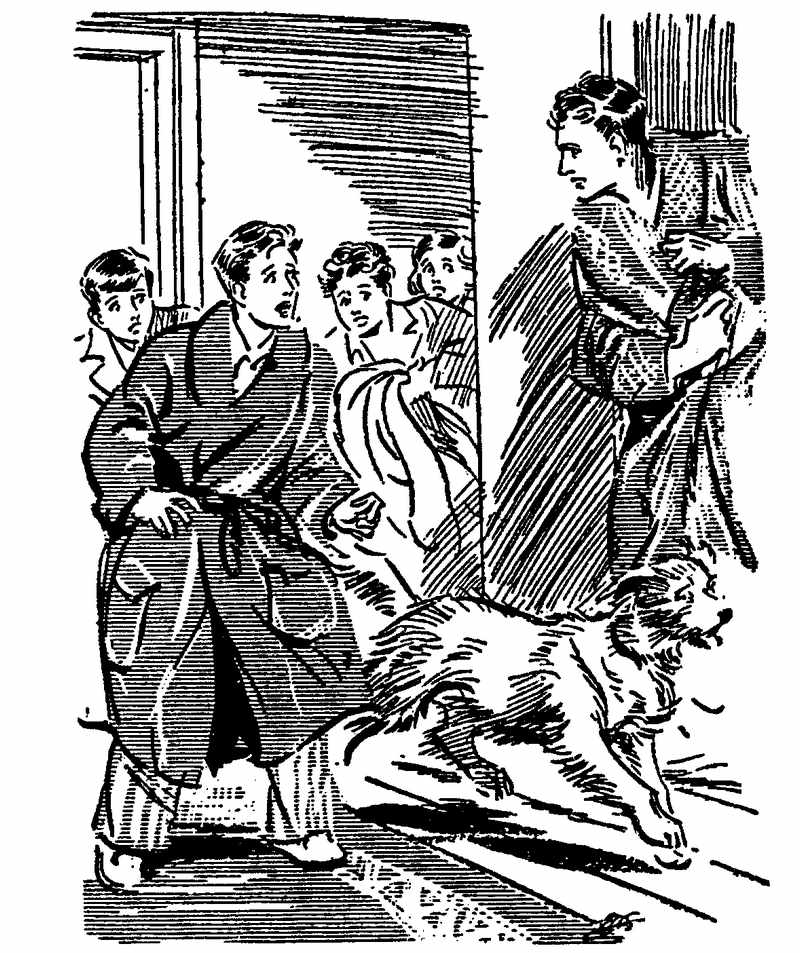 Джордж выпрыгнула из кровати, схватила халат и велела Энн быстро одеваться. Девочки выскочили из комнаты, Тим прошмыгнул у них между ног. Через мгновение в другом конце коридора открылась дверь родительской спальни, и в прямоугольнике света показалась длинная худая фигура. Дядя Квентин спешно запахивал свой халат и завязывал пояс.