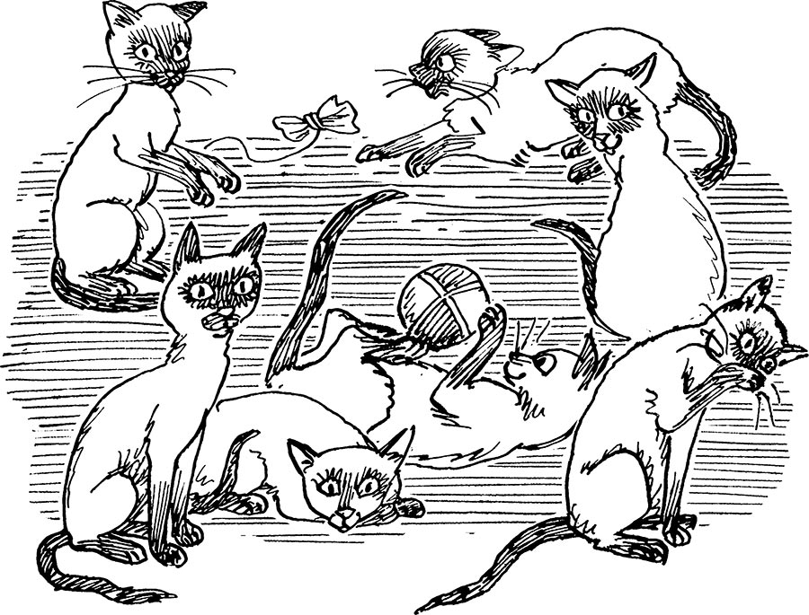 Ребята заглянули в кошачий домик. Кошек было много, и они действительно были необычайной красоты – бежевые и кремовые с тёмно-коричневыми мордочками, ушками, лапками и хвостами. Кошки смотрели на незваных гостей большими сверкающими ярко-голубыми глазами и мяукали на разные голоса.