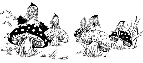 От испуга эльфы аж подпрыгнули на своих грибах, а гном, схватив сумку, помчался прочь.