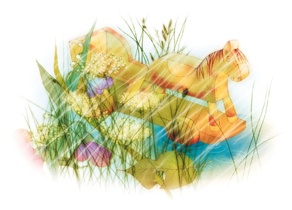 Вот и на этот раз он позабыл деревянную лошадку в густой траве возле изгороди, за которой кончался сад и начиналось большое широкое поле. Вначале лошадке нравилось стоять в зелёной траве: она смотрела на разноцветных бабочек, птичек и кошку, что грелась на солнышке. Но потом погода испортилась: поднялся ветер, – и лошадке стало очень холодно. Вскоре на небе появились чёрные тучи, и начался проливной дождь. Это был настоящий потоп! Рядом с лошадкой образовалась огромная глубокая лужа. Вода затопила деревянную подставку, дошла лошадке до колен, и ей показалось, что ещё немного – и она утонет. Её грива и хвост намокли, ливень смыл краску и с неё, и с тележки. Наконец дождь закончился. Бедная мокрая лошадка грустно стояла возле изгороди, понурив голову, и со слезами на глазах думала, что теперь она никому не нужна и никто не будет её любить и играть с ней – такой она стала облезлой и некрасивой.