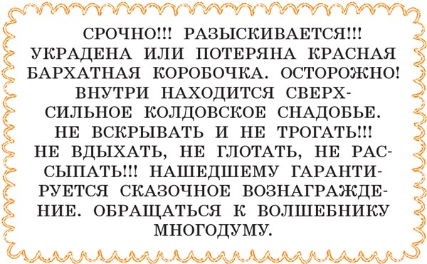 Пёсик завилял хвостом, взял корзинку с запиской и помчался выполнять поручение. Булочник прочитал записку, отрезал кусочек чёрного хлеба, завернул его в бумагу, положил в корзинку, и Пэдди отправился домой. Но по дороге ему встретилась злая ведьма Острошапка. Она, как всегда, была в чёрном плаще и высокой остроконечной чёрной шапке. В руках ведьма держала маленькую коробочку, обтянутую красным бархатом. Пэдди заметил, что ведьма очень спешила и всё время тревожно озиралась по сторонам. Поравнявшись с ним, Острошапка кисло улыбнулась и сказала приторно-ласковым голосом: