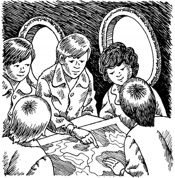 – Мы вот здесь! – сказал Джек, указывая на голубое пятнышко на карте. – Видишь? Это озеро – мы прямо над ним, – а в него впадает река. А знаете что? У нас живая география. Жаль, нельзя именно так учить её в школе! Представляете, каждый раз на географии садимся такие в самолёт и летаем над страной, которую сейчас проходим!