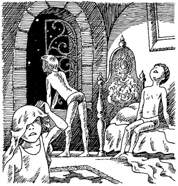 В тот вечер дети так устали, а ведь им ещё пришлось мыться. Засыпая на ходу, они сняли одежду, почистили зубы и искупались. В каждой спальне на полу стояла ванна. К ней вели ступени. Детям показалось забавным подниматься в ванну по ступеням, вместо того чтобы просто перелезть через край.