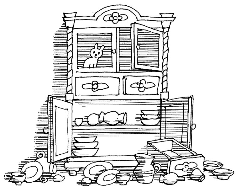 Вдруг послышался какой-то писк. Фатти замер. Что это? Писк повторился, и Фатти пригляделся: из буфета прямо на него смотрели два кошачьих глаза.