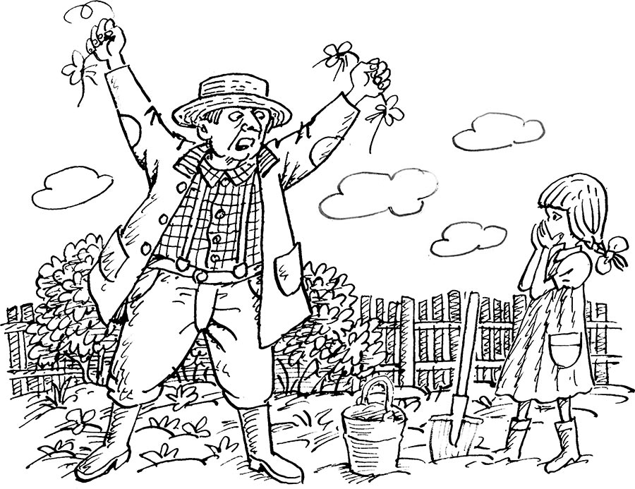 У Склокинга был такой вид, будто его вот-вот хватит удар. Подумать только! Этот мошенник Люк раздаёт рассаду направо и налево! С какой стати мальчишка хозяйничает в его саду? (Склокинг считал, что сад принадлежит ему, а вовсе не леди Кэндлинг. Ему и в голову не пришло, что настоящая хозяйка сада охотно подарила бы девочке клубничные усы. Леди Кэндлинг очень любила детей.)