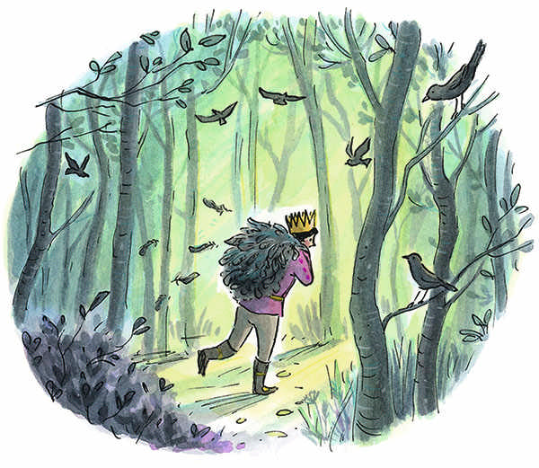 И работа закипела. Дрозды роняли чёрные перья возле Принца, а тот мазал их каштановой смолой и приклеивал сверху на мешок. Очень скоро он так густо покрыл весь мешок перьями, что солнечный свет стал совершенно не виден в сумраке Тёмного леса. Принц преспокойно прошёл через царство желтоглазых гоблинов, и ни один из этих хитрецов не заметил ни Принца, ни мешка, покрытого чёрными перьями.