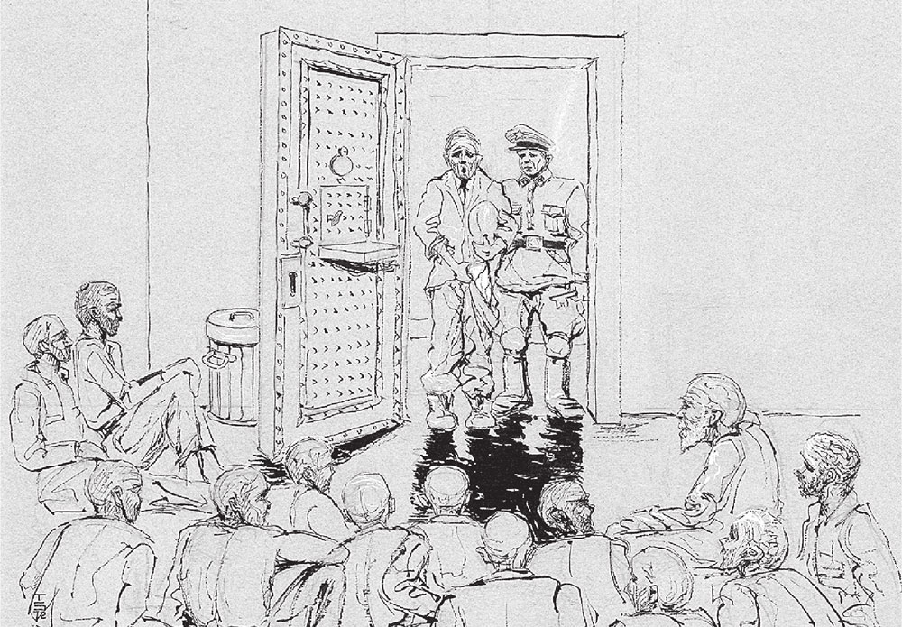 Арестованный входит в свою первую камеру. Рисунок Томаса Сговио, законченный после освобождения