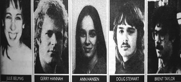 Рис. 1. Слева направо: Джули Бельмас, Джерри Хэннэк, Энн Хэнсен, Дуг Стюарт, Брент Тейлор в 1983 году. Полицейское фото
