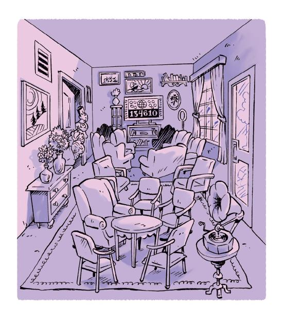 Ребята с облегчением выдохнули. Наконец-то они поняли, откуда идёт звук. Пройдя в одну из открытых дверей, они оказались в просторной комнате, у дальней стены которой стоял допотопный телевизор, а напротив него – несколько разномастных кресел. По телевизору показывали розыгрыш лотереи, а звучный голос принадлежал ведущему, который как раз исчез из виду, блеснув напоследок сияющей белозубой улыбкой.