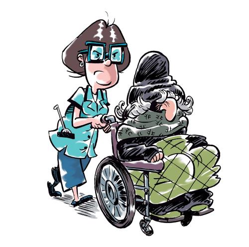 Хозяйка пансионата вошла в вестибюль, толкая перед собой кресло на колёсах, в котором сидела сильно укутанная старушка. На ней было длинное чёрное одеяние, серая шерстяная шаль, закрывающая шею и рот, и большая, скрывающая полголовы чёрная шляпа. Из всей этой кучи одежды выступали только пара седых буклей да огромный крючковатый нос.