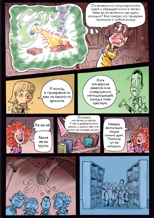Зрелище действительно было странное: на одной из нижних полок ближайшего шкафа книг не было, зато вместо них высилась кучка сыпучего красноватого песка. Бруна обнаружила такую же кучку ещё в одном шкафу. Алекс нашёл неподалеку ещё и третью.