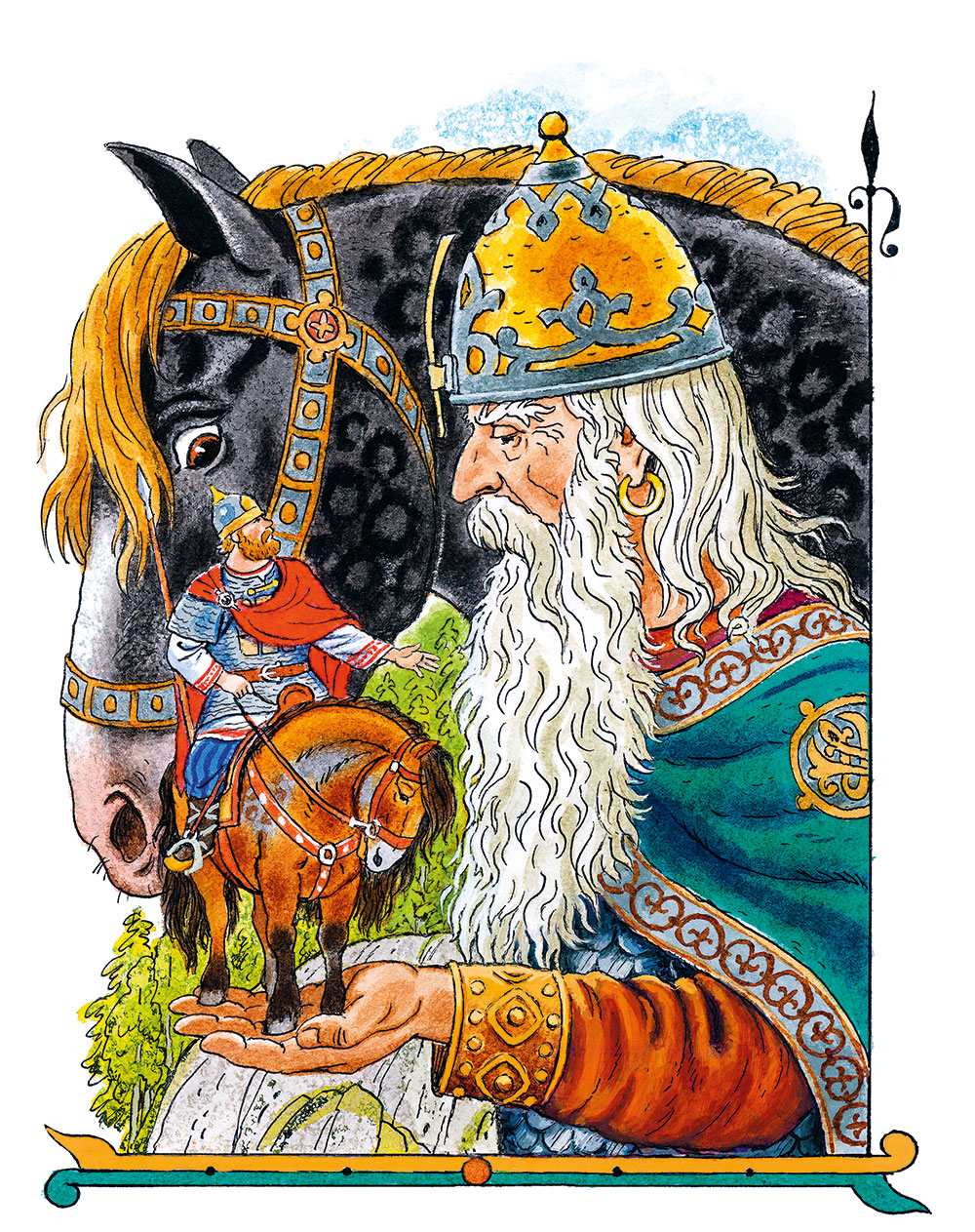 – Служи мне верно, богатырский конь. Не оставь меня ни мёртвым, ни раненым серым волкам на растерзание, чёрным воронам на расклевание, врагам на поругание. Где б мы ни были, домой привези!
