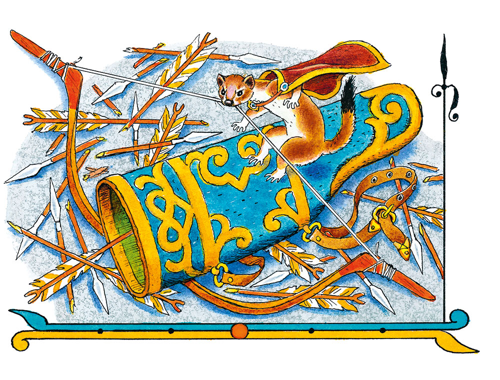 Тут Вольга слетел вниз воробушком, обернулся горностаюшкой. У него тело узкое, зубы острые. Побежал горностай по царскому двору, пробрался в глубокие подвалы царские. Там у луков тугих тетиву пооткусывал, у стрел древки перегрыз, сабли повыщербил, пáлицы дугой согнул.