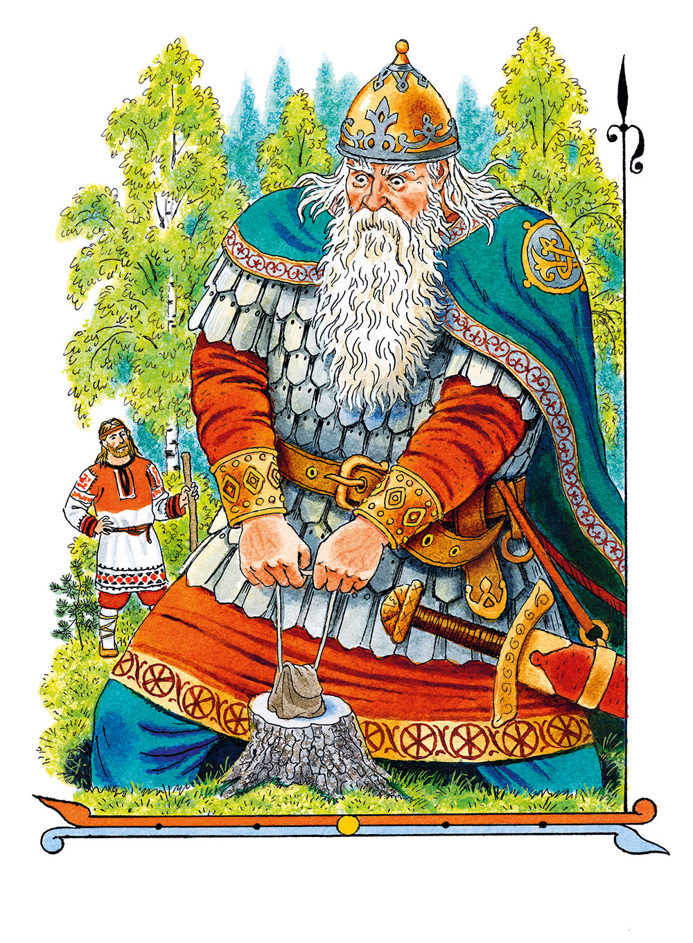 Зашёл Святогор в кузницу и видит: стоит у наковальни седой старичок, одной рукой меха раздувает, другой молотом по наковальне бьёт, а на наковальне-то не видно ничего…