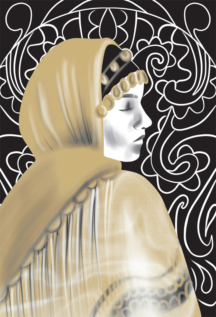 А прямо перед Индигой стоял брат его Соломдига, красивую девушку за руку держал. Такой красивой не видел еще Индига. Ресницы у девушки – камыш, глаза – желтые, как солнце сияли. Желтый халат свадебный на девушке, на халате черные полосы, будто на тигровой шкуре.