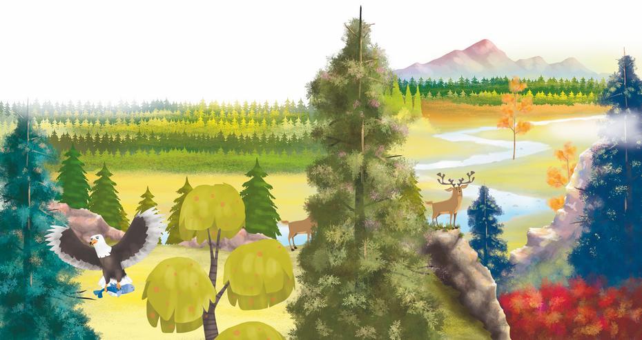 В далёком-далёком краю, где не ступала нога человека, стоял высокий-высокий лес. Вершины могучих деревьев доставали до самых облаков, а когда лес качался, он пел, и его ласковая протяжная песня разносилась по всем сторонам света. Через лес текла речка, сбегая со снежных вершин. Там, в горах, она была ещё маленьким ручьём, но, подхватывая другие ручейки, речка росла, становилась быстрее и несла влагу всему живому. В конце своего долгого пути, уже совсем большая, река впадала в море.