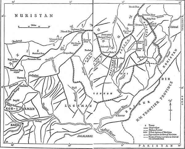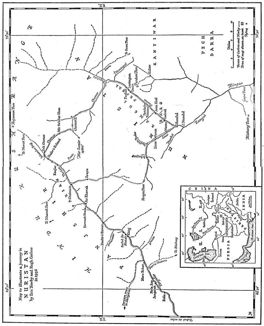 I have just returned from an expedition to the borders of Nuristan, The Country of Light. This is the place for you. It lies in the extreme N.E. of Afghanistan, bordering on Chitral and enclosed by the main range of the Hindu-Kush mountains. Until 1895 it was called Kafiristan, The Country of the Unbelievers. We didn’t get in but we didn’t expect to, the passes are all over 15,000 feet and we didn’t have permission. So far as I can discover no Englishman has been there since Robertson in 1891. The last Europeans to visit it – von Dückelmann apart – were a German expedition in 1935, and it’s possible that no one has visited the north-west corner at all. I went with Bob Dreesen of the American Embassy.