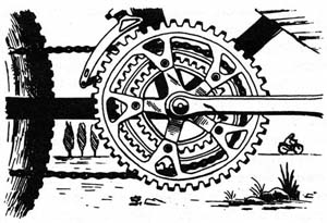Most of them are fitted with 15- or 18-speed derailleur gears made up by fitting a five- or six-sprocket freewheel block on the rear hub and three chainwheels of different sizes on the main axle in the bottom bracket where the cranks are situated; a sophistication so conspicuously unnecessary that it would have had Thorsten Veblen ecstatically adding another chapter to his great work, The Theory of the Leisure Class, had he lived to see it. This equipment produces gears ranging from 20″ or even lower (which can be a godsend when climbing mountains) to 90″ or even higher for racing downhill, or with a following wind on the flat.1 Not all these gears are practicable or even usable, however, for technical reasons.