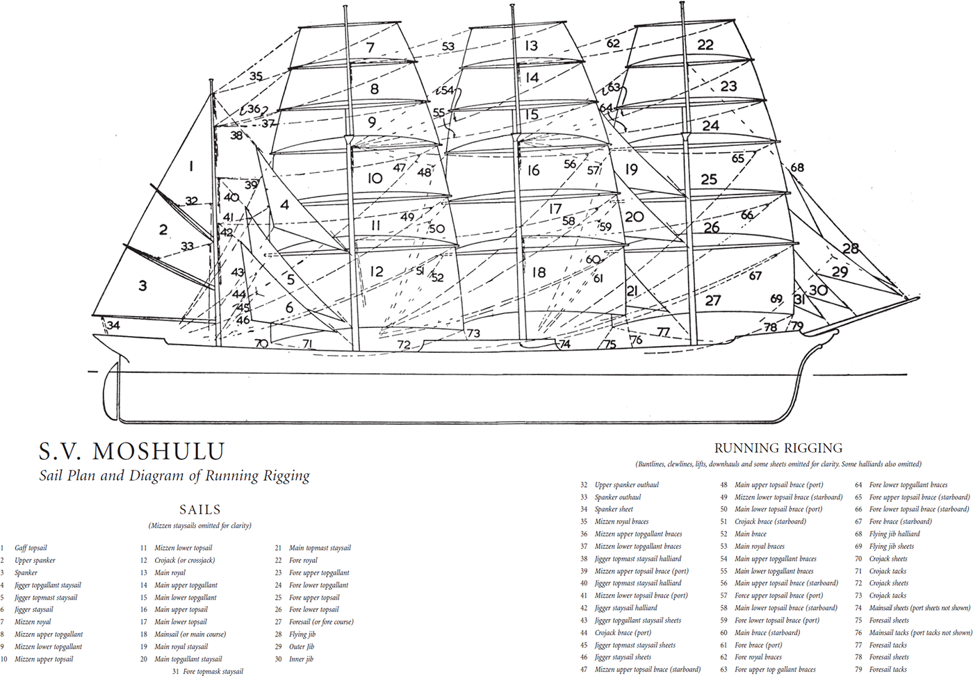 In those twenty-four hours the port and starboard watches, eight men to a watch, took in, re-set, took and re-set again twenty-eight sails – the heaviest of which weighed 1½ tons – a total of 112 operations; bent two new sails and wore the ship to a new tack twice, an operation which required all hands, including the cook, and which took an hour each time it was done. The starboard watch were unlucky, having to spend eleven consecutive hours on deck. This was by no means uncommon. Yet strangely enough, I look back on the time I spent in Moshulu with great pleasure.