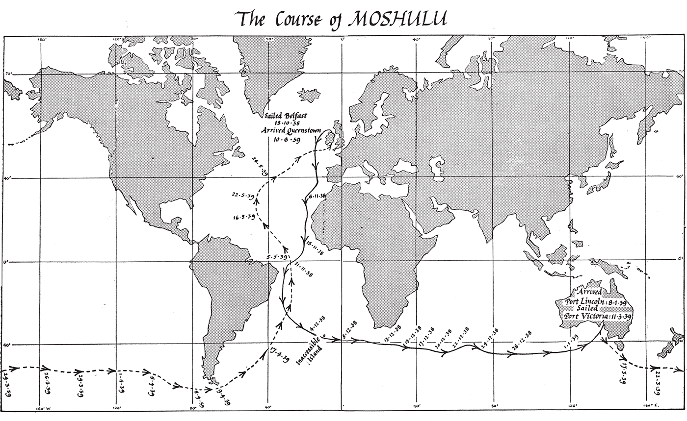 Although I did not know it when I joined the four-masted barque Moshulu in Belfast in the autumn of 1938, this was to be her last voyage in the Australian grain trade, as it was to be for the rest of Gustav Erikson’s fleet of sailing ships, as well as for most of the German and Swedish ships which took part in the 1939 sailings from South Australia to Europe. In that year thirteen three-and four-masted barques sailed for Europe, eleven of them by way of Cape Horn, and by the autumn all of them were back in European waters; but although one or two of them continued to sail during the first year or so of the war, carrying various cargoes, and some even survived into the post-war years, the big Finnish fleet of Gustav Erikson was dispersed and the ships never came together again to form the great concourse of vessels which lay in Spencer Gulf, South Australia, in the early months of 1939.