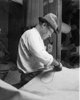 As I entered the sail loft I had an impression of a solid chunky man with spectacles set on a rather snub nose and a face covered with grey stubble. He was sitting in his shirt sleeves reading The Seven Pillars of Wisdom. In his mouth was a pipe that had gone out and on his head a unique hat. It was an ordinary grey felt hat, tweeked up in the middle like a scoutmaster’s, punctured with a number of holes that might have been made by bullets, intended, he said, to allow the air to circulate. I noticed that his fingers were rather stubby but that the nails were very finely formed. He had a wonderful smell about him compounded of hemp and Stockholm tar.