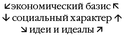 Концепция социального характера также служит для объяснения связи между материальным базисом общества и «идеологической надстройкой». Марксу часто приписывали утверждение о том, что идеологическая надстройка – всего лишь отражение экономического базиса. Такая интерпретация неверна; дело в том, что в теории Маркса природа связи между базисом и надстройкой не была достаточным образом объяснена. Динамическая психология может показать, что общество порождает социальный характер, а социальный характер имеет тенденцию вырабатывать идеологию, которая его удовлетворяет и им питается. Однако порождение экономическим базисом определенного социального характера, который, в свою очередь, порождает определенные идеи, не однонаправлено: идеи, однажды возникнув, также влияют на социальный характер и косвенно на социоэкономическую структуру. Я хочу подчеркнуть следующее: социальный характер – посредник между социоэкономической структурой и идеями и идеалами, распространенными в обществе. Это посредник, который действует в обоих направлениях: от экономического базиса к идеям и от идей к экономическому базису. Данное положение иллюстрирует следующая схема: