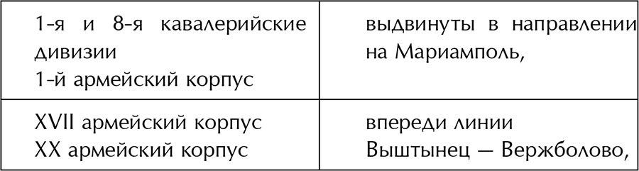 8-я и 1-я кавалерийские дивизии предшествовали I армейскому корпусу в направлении на шоссе Вержболово – Ковно.
