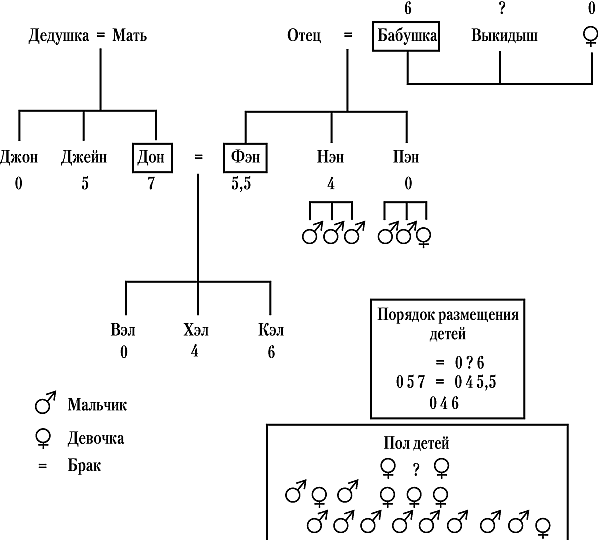 На рис. 5 показано такое семейное древо. В семье Эйбл трое мальчиков: Кэл, Хэл и Вэл. Когда родился Вэл, Хэлу было четыре года, а Кэлу шесть, так что их порядок 0–4–6. Их отец Дон был старшим из детей, размещенных в порядке 0–5–7. Их мать, Фэн, старшая из трех дочерей, размещенных в порядке 0–4–5. У двух сестер матери, Нэн и Пэн, тоже по трое детей. Мать Фэн была старшей из двух дочерей, порядок которых – 0–6, с выкидышем между ними. Легко заметить, что все эти тройки детей рождались на протяжении пяти-семи наиболее плодовитых лет.