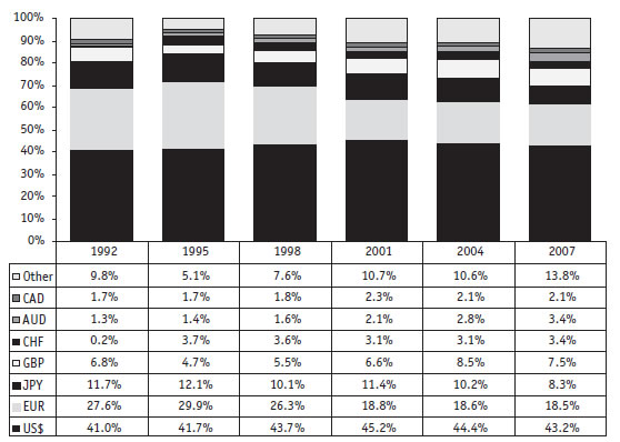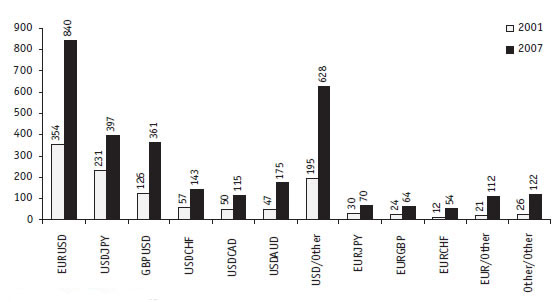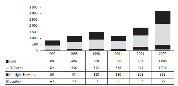 По данным Bank for International Settlements (BIS, http://www.bis.org) среднедневной объем торгов на мировом валютном рынке Forex в апреле 2007 г. достиг $3.2 трлн, т. е. более чем в два раза превысил уровень 1998 г. ($1.5 трлн), увеличившись в течение последних 20 лет в 5 раз. Особенно заметный рост произошел после кризиса 2001 г.