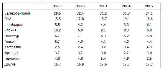 Около 50 % всего объема торгов на Forex находится в Европе. На азиатские и американские рынки приходится примерно по 25 % объемов торгов. При этом безусловным лидером валютного рынка остается Лондон, доля которого в 2007 г. составила 35 % мирового Forex. А доля традиционных стран – в первую очередь Японии и Германии – на фоне роста удельного веса рынков развивающихся стран, Австралии и США снижается (табл. 1.2).
