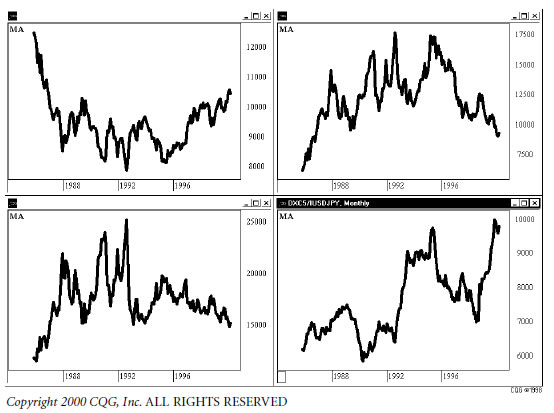 Рис. 1.5. Динамика индексов четверки ведущих мировых валют – доллара США, японской иены, евро и британского фунта стерлингов с 1987 по 2000 г.