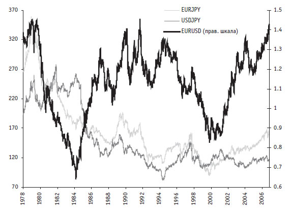 Рис. 1.8. Номинальные валютные курсы EURUSD, EURJPY и USDJPY (1978–2007)