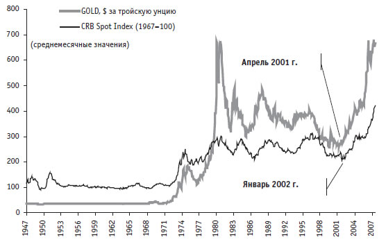 Рис. 1.17. Динамика цен на золото и товарного индекса CRB