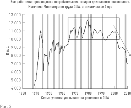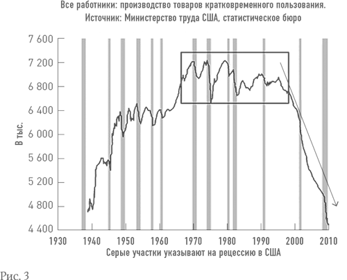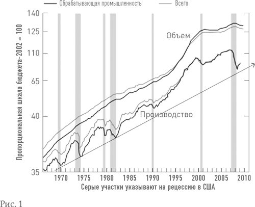 * * *В мировой экономике происходят огромные перемены, и в мире никогда не было так много предпринимателей, как сейчас. Всего один пример: в прессе без конца пишут о том, что в последние два десятилетия количество рабочих мест в Соединенных Штатах неуклонно сокращается. Но при этом никто не говорит о сокращении производственных мощностей. Действительно, в США выпускается все больше и больше товаров (за последние десять лет их количество выросло на 15 %), хотя рабочих мест при этом становится все меньше (см. рис. 1, 2, 3). Благодаря современным теориям менеджмента и развитию технологий произошел огромный скачок производительности. Сегодня наши производственные мощности так велики, что мы просто не знаем, что с ними делать[2].