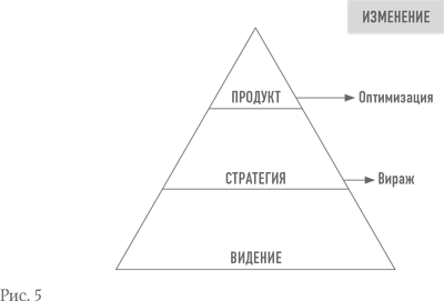 Продукт – конечный результат этой стратегии (см. рис. 4). В процессе оптимизации продукт постоянно меняется. Я называю это настройкой механизма. Возможно, стратегию придется изменить (это называется виражом). Но общее видение меняется редко. Что бы ни случилось, предприниматель не упускает из виду свою цель, и каждая неудача помогает ему понять, как попасть туда, куда он хочет (см. рис. 5).
