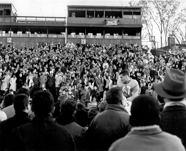 Товарищи по команде на руках уносят Билла с поля после победы Колумбийского университета над Университетом штата Пенсильвания со счетом 37:6, 18 ноября 1961 года. Этот матч принес ему титул чемпионов Лиги Плюща, впервые в его истории. {4}