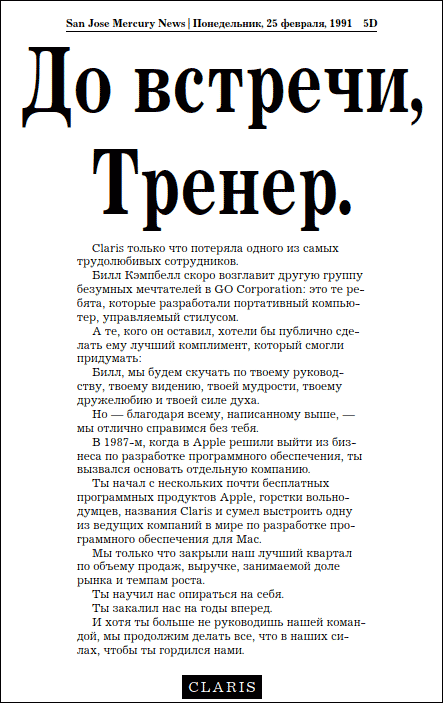 «К черту! Мы ее покажем», – был ответ Билла. Они так и не сказали совету директоров или кому-либо еще из высшего руководства, что у них был потенциальный покупатель на эфирное время, и показали ролик. Он стал не только самым популярным во время того матча, но и одним из самых известных в истории, положив начало новой эпохе, когда реклама на Суперкубке стала так же важна, как сама игра. В 2017 году колонка в Los Angeles Times назвала ролик «единственной великой рекламой, показанной на Суперкубке». {9} Неплохо для «тупого футбольного тренера», который меньше пяти лет назад завершил свой последний сезон. В 1987 году в Apple решили основать отдельную компанию по разработке программного обеспечения под названием Claris. Возглавить ее предложили Биллу. Он ухватился за эту возможность. Дела у Claris шли неплохо, но к 1990 году Apple взяла ее обратно под свое крыло в качестве дочернего предприятия, отказавшись от изначального плана сделать ее публичной компанией. Эта «смена курса» побудила Билла и еще нескольких человек из высшего руководства уволиться. Решение было эмоциональным, и, когда Билл ушел, некоторые сотрудники Claris выразили свою благодарность ему, разместив рекламу на целую полосу в San Jose Mercury News. «До встречи, Тренер», – гласил заголовок. «Билл, мы будем скучать по твоему руководству, твоему видению, твоей мудрости, твоему дружелюбию и твоей силе духа… – продолжал текст статьи. – Ты научил нас опираться на себя. Ты закалил нас на годы вперед. И хотя ты больше не руководишь нашей командой, мы продолжим делать все, что в наших силах, чтобы ты гордился нами». Claris продержалась в качестве дочерней компании Apple до 1998 года. Билл стал генеральным директором стартапа под названием GO Corporation, который предпринял попытку создать первый в мире карманный компьютер, управляемый стилусом (предшественник PalmPilot и современных смартфонов). Это была амбициозная, но слишком преждевременная идея, и компания прекратила существование в 1994 году. «GO не пошло»[6], – любил говорить Билл. Примерно в то же время сооснователь и генеральный директор компании Intuit Скотт Кук вместе с советом директоров искали кого-то, кто мог бы заменить его в этой должности. Джон Доер[7], венчурный инвестор из Kleiner Perkins, познакомил Билла со Скоттом. Поначалу тренер не произвел на того впечатления. Прошло несколько месяцев, у Скотта все еще не было подходящей кандидатуры, и он согласился снова встретиться с Биллом.