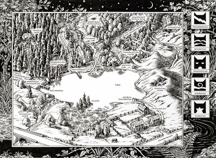 THUNDERCLAN LEADER FIRESTAR—ginger tom with a flame-coloured pelt DEPUTY GREYSTRIPE—long-haired grey tom MEDICINE GAT CINDERPELT—dark grey she-cat APPRENTICE, LEAFPOOL WARRIORS (toms, and she-cats without kits) DUSTPELT—dark brown tabby tom SANDSTORM—pale ginger she-cat CLOUDTAIL—long-haired white tom BRACKENFUR—golden brown tabby tom APPRENTICE, WHITEPAW THORNCLAW—golden brown tabby tom BRIGHTHEART—white she-cat with ginger patches BRAMBLECLAW—dark brown tabby tom with amber eyes ASHFUR—pale grey (with darker flecks) tom, dark blue eyes RAINWHISKER—dark grey tom with blue eyes SOOTFUR—lighter grey tom with amber eyes SQUIRRELFLIGHT—dark ginger she-cat with green eyes SPIDERLEG—long-limbed black tom with brown underbelly and amber eyes APPRENTICES (more than six moons old, in training to become warriors) LEAFPOOL—light brown tabby she-cat with amber eyes WHITEPAW—white she-cat with green eyes QUEENS (she-cats expecting or nursing kits) FERNCLOUD—pale grey (with darker flecks) she-cat, green eyes, mother of Dustpelt’s kits SORRELTAIL—tortoiseshell and white she-cat with amber eyes ELDERS (former warriors and queens, now retired) GOLDENFLOWER—pale ginger she-cat, the oldest nursery queen LONGTAIL—pale tabby tom with black stripes, retired early due to failing sight MOUSEFUR—small dusky brown she-cat SHADOWCLAN LEADER BLACKSTAR—large white tom with huge jet black paws DEPUTY RUSSETFUR—dark ginger she-cat MEDICINE CAT LITTLECLOUD—very small tabby tom WARRIORS (toms, and she-cats without kits) OAKFUR—small brown tom APPRENTICE, SMOKEPAW CEDARHEART—dark grey tom ROWANCLAW—ginger tom APPRENTICE, TALONPAW TAWNYPELT—tortoiseshell she-cat with green eyes QUEENS (she-cats expecting or nursing kits) TALLPOPPY—long-legged light brown tabby she-cat ELDERS (former warriors and queens, now retired) BOULDER—skinny grey tom WINDCLAN LEADER ONESTAR—brown tabby tom DEPUTY ASHFOOT—grey she-cat MEDICINE CAT BARKFACE—short-tailed brown tom WARRIORS (toms, and she-cats without kits) TORNEAR—tabby tom WEBFOOT—dark grey tabby tom CROWFEATHER—dark grey tom OWLWHISKER—light brown tabby tom NIGHTCLOUD—black she-cat WEASELFUR—ginger tom with white paws QUEENS (she-cats expecting or nursing kits) WHITETAIL—small white she-cat ELDERS (former warriors and queens, now retired) MORNINGFLOWER—tortoiseshell queen RUSHTAIL—light brown tom RIVERCLAN LEADER LEOPARDSTAR—unusually spotted golden tabby she-cat DEPUTY MISTYFOOT—grey she-cat with blue eyes MEDICINE CAT MOTHWING—dappled golden she-cat WARRIORS (toms, and she-cats without kits) BLACKCLAW—smoky black tom APPRENTICE, BEECHPAW HAWKFROST—dark brown tom with a white underbelly and ice-blue eyes VOLETOOTH—small brown tabby tom SWALLOWTAIL—dark tabby she-cat STONESTREAM—grey tom REEDWHISKER—black tom APPRENTICE, RIPPLEPAW QUEENS (she-cats expecting or nursing kits) MOSSPELT—tortoiseshell she-cat with blue eyes DAWNFLOWER—pale grey she-cat kits = Minnowkit (black) + Pebblekit (grey) ELDERS (former warriors and queens, now retired) HEAVYSTEP—thickset tabby tom IVYTAIL—brown tabby she-cat THE TRIBE OF RUSHING WATER BROOK WHERE SMALL FISH SWIM (BROOK)—brown tabby she-cat STORMFUR—dark grey tom with amber eyes OTHER ANIMALS SMOKY—muscular grey and white tom who lives in a barn at the horse place DAISY—she-cat with long creamy-brown fur who lives at the horse place FLOSS—small grey and white she-cat who lives at the horse place PIP—black and white terrier who lives with Twolegs near the horse place MIDNIGHT—a star-gazing badger who lives by the seaMAPS