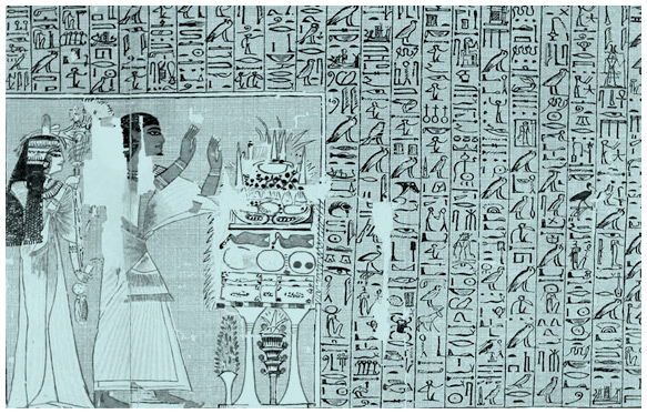 Писец Ани, воздев руки в позе адорации, стоит перед жертвенным столом с приношениями, состоящими из бычьих ног и жертвенных пирогов, сосудов с вином и маслом, фруктов, цветов лотоса и других цветов. На нем бело-шафрановые одежды, на голове – парик, на шее – ожерелье, руки унизаны браслетами. Позади Ани стоит его жена – «Осирис госпожа дома, певица Амона Туту»[29]; облаченная подобно мужу, она держит систр и виноградную (?) лозу в правой руке и ожерелье менат в левой.