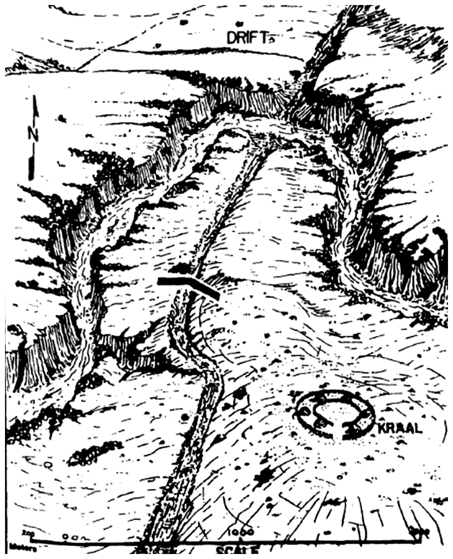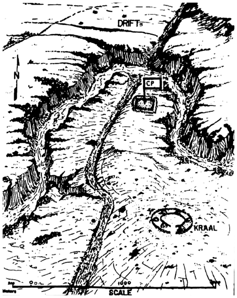 Я решил, что так как брод не может вскочить и убежать, то нет нужды разворачивать нашу позицию или сторожевые посты особо близко к нему, особенно если такая позиция рискует оказаться под обстрелом с близкого расстояния со стороны берега, подходы к которому плохо просматриваются и который служит отличным укрытием. Самым что ни на есть худшим решением представлялось расположиться внутри «подковы» речного русла, так как там противник смог бы практически нас окружить. Дальше на юг местность постепенно поднималась, и, соответственно, мой выбор пал на точку в 700–800 метрах к югу от брода, где я приказал вырыть траншею, обращенную примерно на север (фронт). Таким образом, перед нашим фронтом было где-то 800 метров открытого пространства. Как это заведено, мы начали рыть для 50 моих солдат траншею длиной где-то в 50 метров.