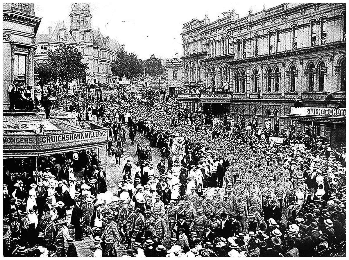 Новозеландские войска маршируют по Уэлсли-стрит в Окленде, направляясь в Южную Африку