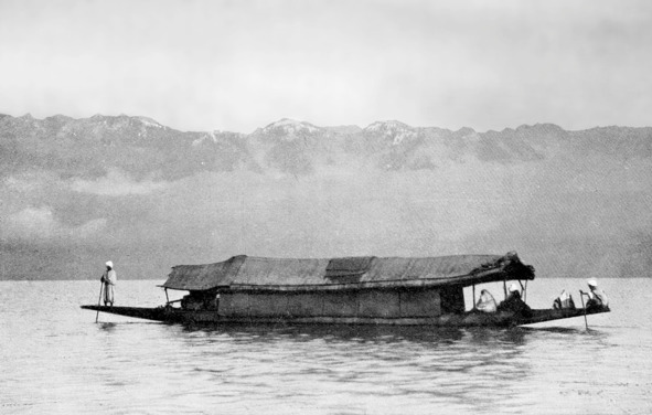 Обратим свой взор на юго-запад. Нам откроется дивная панорама непрерывной 80-мильной горной цепи ослепительно белых пиков, возвышающихся почти на 10 тысяч футов над уровнем долины: это уходящий вдаль хребет Пир-Панджал, чьи склоны, лежащие на высотах более 5000 футов, до поздней весны бывают покрыты снегами. Обширный лесной пояс из белых пихт, гималайских елей и голубых сосен простирается вдоль основания хребта вплоть до половины его высоты, образуя тёмную волнистую линию на белоснежном фоне. Снежная мантия верхних полей тут и там как бы сползает вниз на тысячи футов в лесную зону по крутым расселинам и ущельям. Вся предстающая взору картина выглядит так, будто хребет вздымается ввысь сразу же за дальним берегом озера.